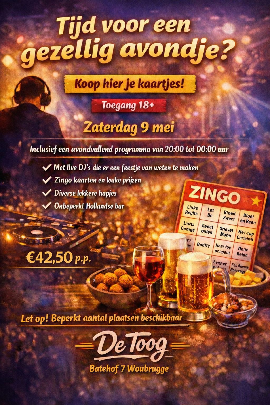 De hele avond word je verwend met lekkere hapjes en drankjes, terwijl onze live DJ’s zorgen voor een avondvullend programma vol muziek, gezelligheid en natuurlijk Zingo-plezier. Stilzitten is geen optie 😉